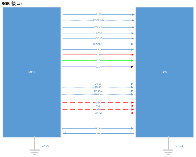 2.कार्यात्मक सीमा स्पष्ट करा: शुद्ध RGB इंटरफेस हा उच्च-गती "वन-वे डिस्प्ले डेटा चॅनल" आहे जो आरंभिक आदेश किंवा वाचन स्थिती प्रसारित करण्यास अक्षम आहे. अशा प्रकारे, सानुकूल एलसीडी प्रकल्पांमध्ये, ते सहसा SPI सारख्या कंट्रोल इंटरफेससह सहयोग करते, जे स्क्रीन इनिशिएलायझेशन आणि व्यवस्थापन हाताळते.