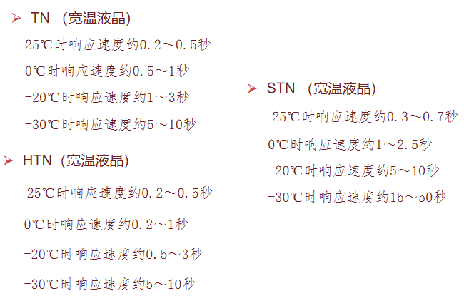 प्रतिसादाचा वेग, उदय वेळ (Tr) आणि पडण्याची वेळ (Tf) सह, LCD स्क्रीन सिग्नलला किती लवकर प्रतिसाद देते हे मोजते. लिक्विड क्रिस्टल्सचे रिओलॉजिकल गुणधर्म त्यांचे मजबूत तापमान अवलंबित्व निर्धारित करतात: तापमान जितके कमी असेल तितके लिक्विड क्रिस्टल स्निग्धता जास्त असेल आणि प्रतिसादाचा वेग कमी असेल.